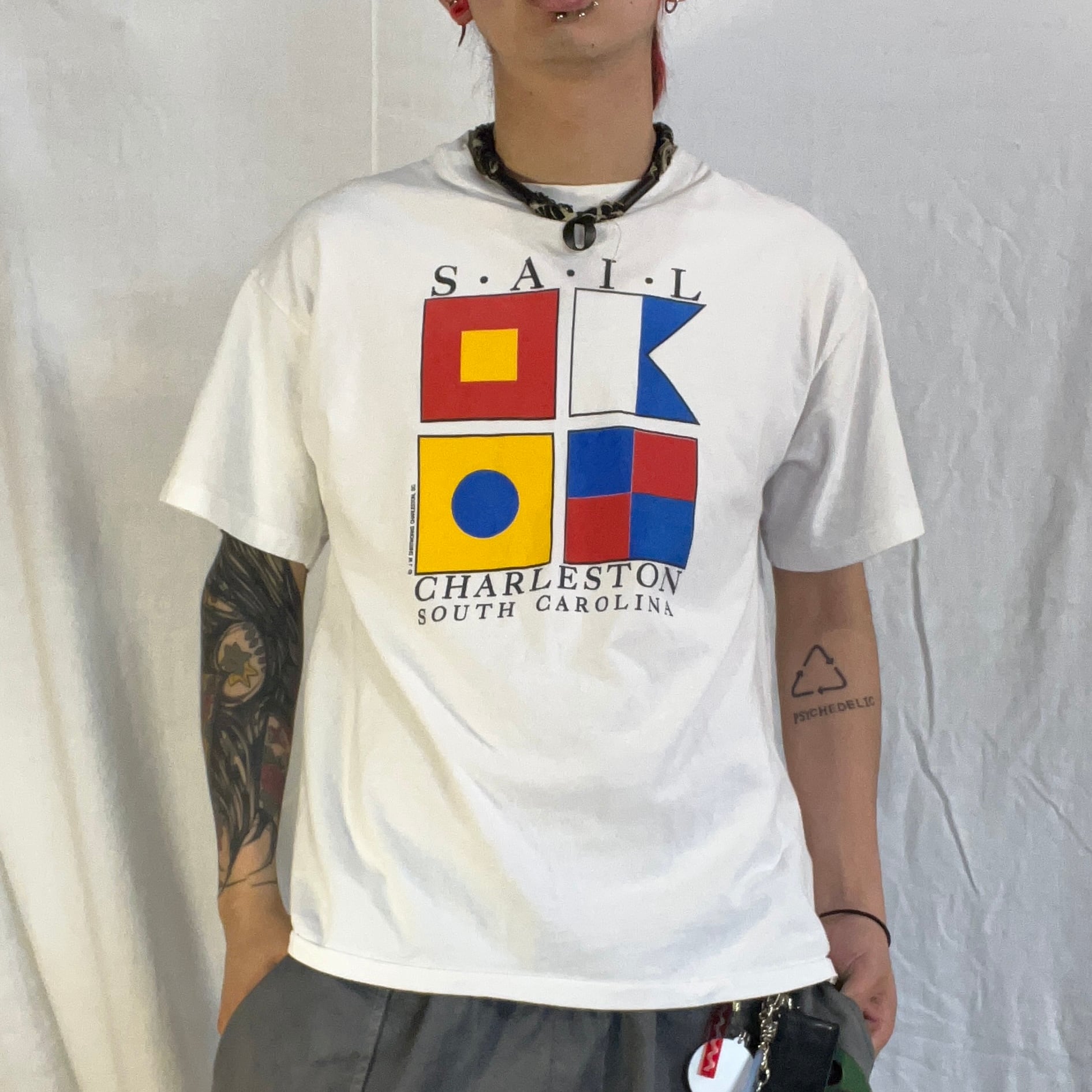 身幅:52 着丈:62 肩幅:53 袖丈:21 サイズ表記:L 素材表記:100%コットン 管理番号:2623
